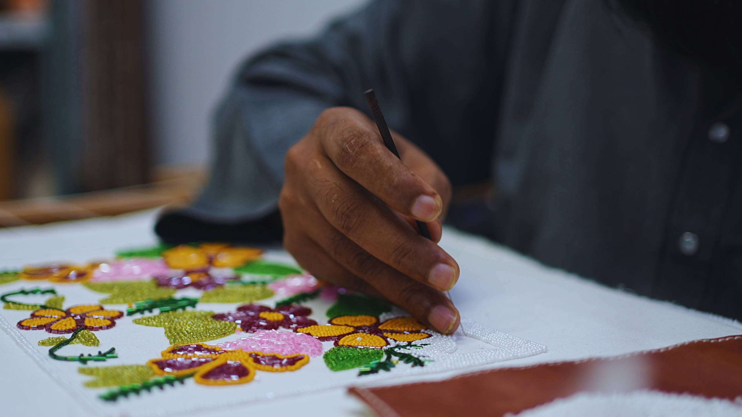 Craft meets contemporary. The Noor Baguette pairs intricate, hand‑beaded Indian paisley with a clean, modern...