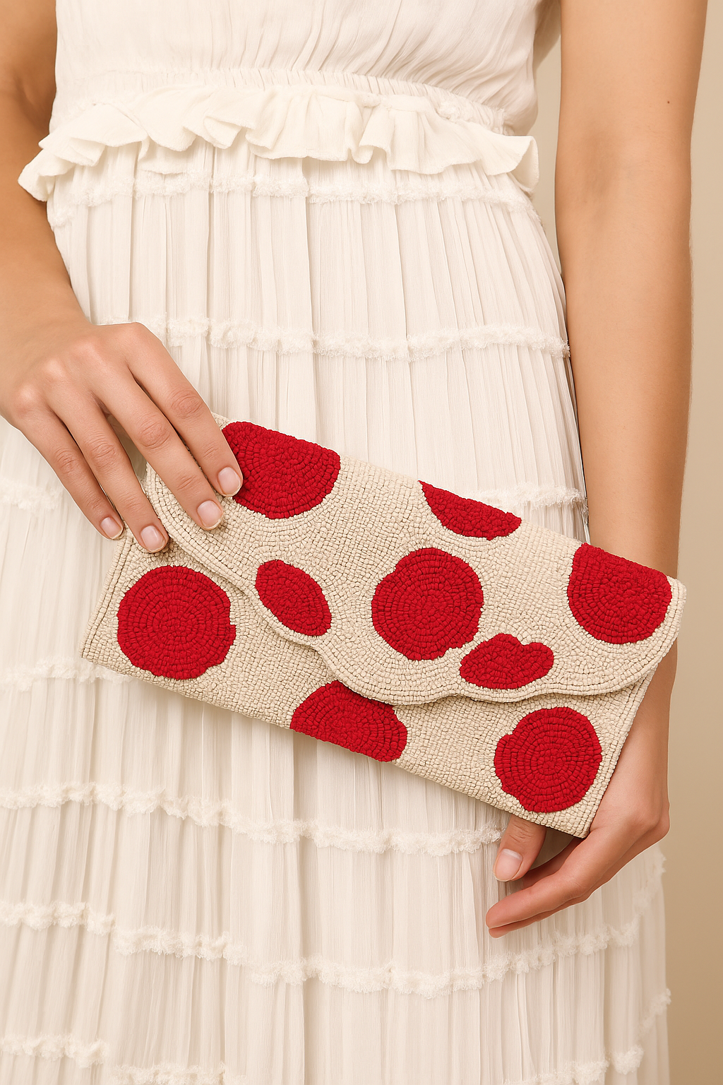 A sleek envelope clutch hand‑beaded with bold red rose‑petal motifs over a refined beige base....