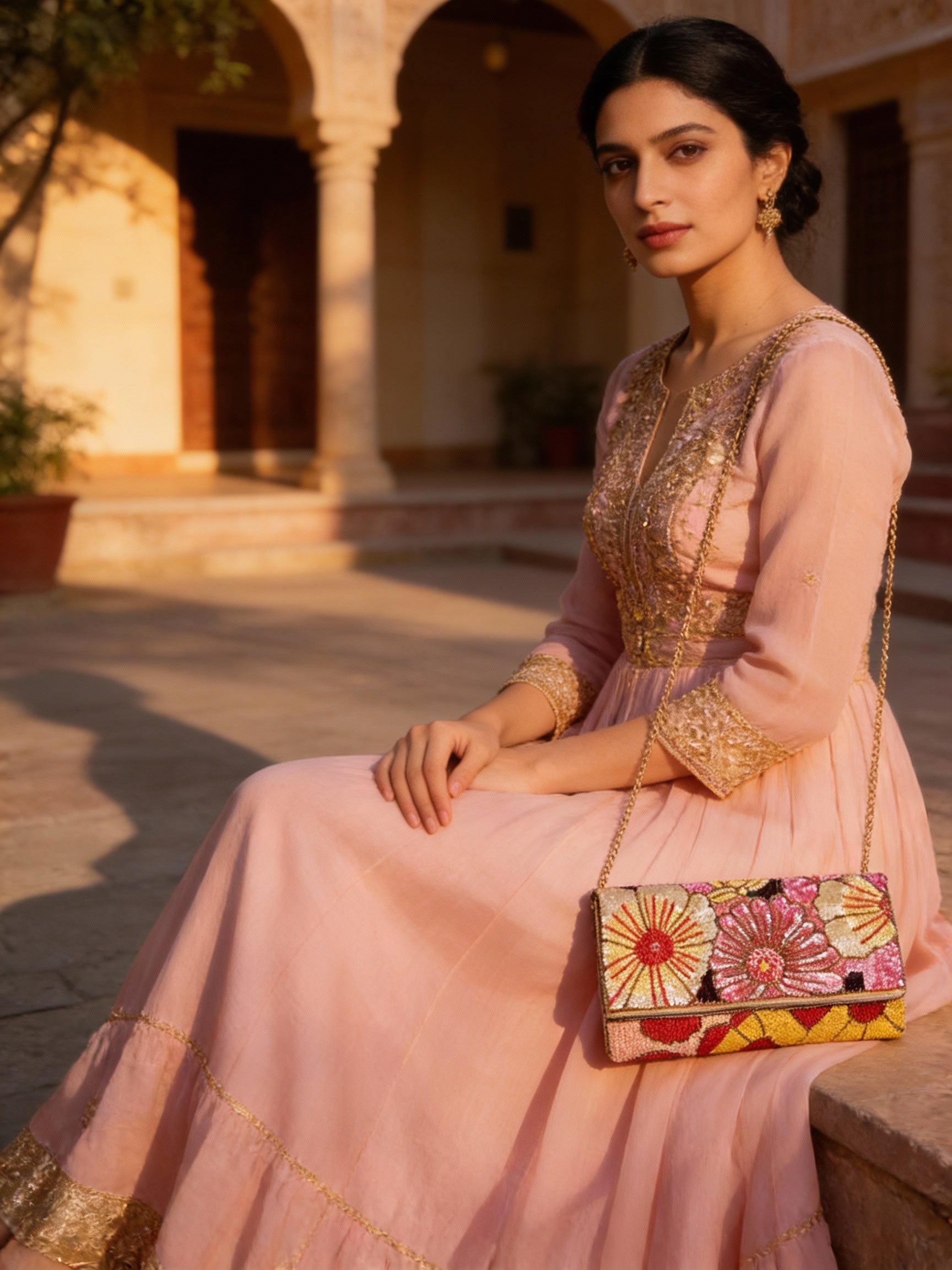 A luminous fold‑over clutch alive with beaded florals and shimmering sequins in blush, champagne gold, and ruby tones. Inspired by blooming gardens and Indian beadwork traditions, the slim chain lets it shift from handheld to shoulder in seconds—heritage craft with modern, day‑to‑evening ease.