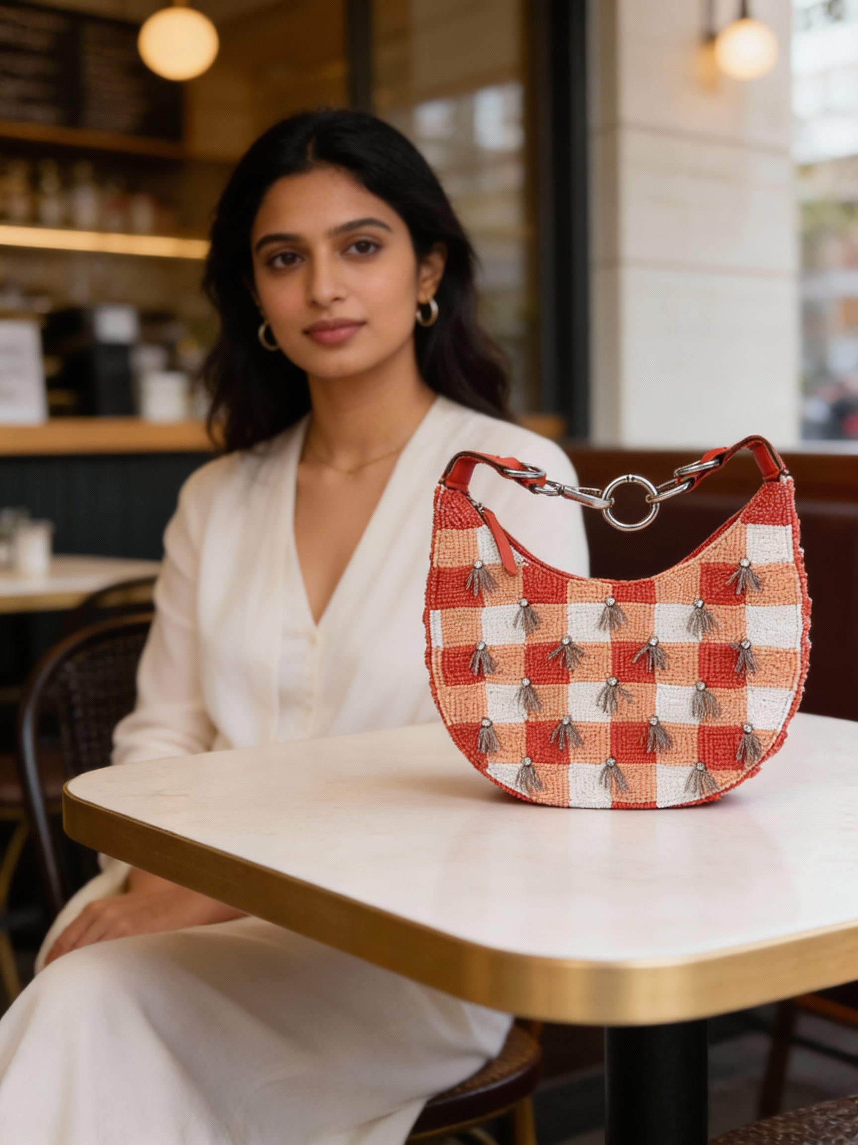 A statement crescent hobo that blends contemporary hardware with exquisite hand‑beading. Warm coral, peach, and ivory squares are embellished with delicate metallic tassels, while a sculptural ring‑link handle adds urban elegance. Crafted by master artisans, this zip‑top shoulder bag is designed to elevate smart‑casual looks and evening plans alike—artistry with everyday ease.