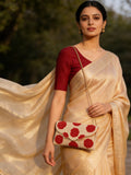 A sleek envelope clutch hand‑beaded with bold red rose‑petal motifs over a refined beige base. Crafted by Indian master artisans, every stitch celebrates cultural craftsmanship while the slim chain and magnetic flap keep it modern and fuss‑free for office dinners, weddings, and festive nights.